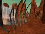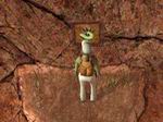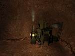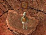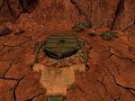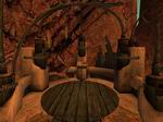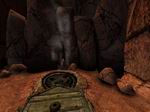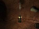 明るくなったところで、洞窟を見渡すと中央の滝つぼよりの壁際にも木の籠があって左の奥にもライトがありその左側にはさらに奥へと続く通路がありますが、暗くて先に進めません。滝の近くには岩でできているペデスタルにリンキングストーンが置いてあります。このリンキングストーンで接続すると、ドニシティーのDRC事務所へ接続しますが、今はエデル・ケモへの接続書を使ってエデル・ケモに向かいます。