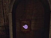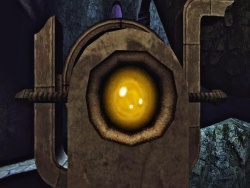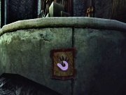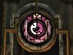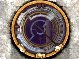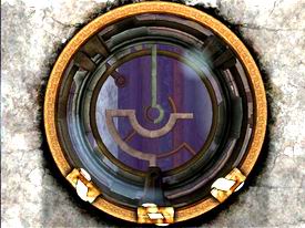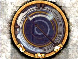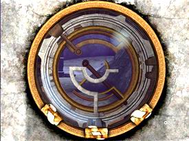 ギャラリーから戻ったらテレスコープの所に行きます。テレスコープを覗くと下の方には3つのボタンがあります。それぞれタール・ブラウン・ライトブラウンのサークルが反時計回りに廻ります。この3つのサークルの組み合わせを、ドニシティーのギャラリーにあったサークルが3つ縦に並んだステンドグラスパネル中の、一番上のサークルと同じように見えるようにします。