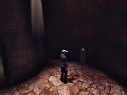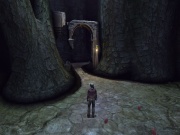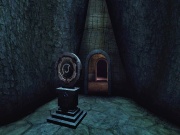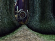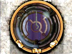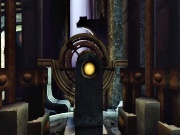 先程左に曲がったT字路から今度は右に進みます。すると最後のテレスコープが広場にあります。ここでは、ドニシティーのギャラリーにあったサークルが3つ縦に並んだステンドグラスパネルの一番下のものと同じように見えるようにします。するとテレスコープの先の方にある壁のドアが開きます。開いたドアから入って丸い部屋の奥へ進むと、左側に青く光るボタンがあります。それをクリックすると丸い部屋の壁が回って、部屋のドアが閉じてしまいます。そしてそこから3枚目の旅の布(ジャーニークロス)が出現します。
