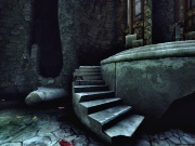 最初に接続して来た所に戻り、今度は右側の道を進みます。T字路を左に進むと奥に円柱状のプラットフォームがあります。正面右側には2枚目の旅の布(ジャーニークロス)があります。左側にある階段を上ると先程の建物で見かけたものと同じテレスコープがあります。今度はドニシティーのギャラリーにあったサークルが3つ縦に並んだステンドグラスパネルの中央のものと同じように見えるようにします。プラットフォームの奥にはドニシティーの別のブロックにあるバルコニーに接続するリンキング・ストーンがあるので一応確認しておきます。接続してしまった場合はバルコニーからは出られないので、一旦レルト経由でここまで戻りましょう。