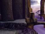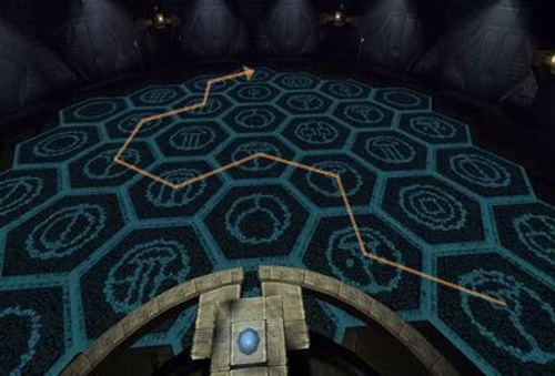 影の道の出口から出てそのまま通路を進むと絶壁に辿り着きます。左側には円形のゲートと地割れが見えます。そして地割れの先にはイーシャページが落ちています。またゲートの奥へ進むとピラミッド型の建物があります。建物の右側に回り込むと建物のくぼみの所の奥に4枚目の旅の布(ジャーニークロス)があります。ピラミッドの中に入ると、フロアは六角形のタイルで覆われていて、正面にはブルークリスタルボタンがあるプラットフォームがあります。このボタンは部屋の照明ボタンです