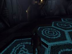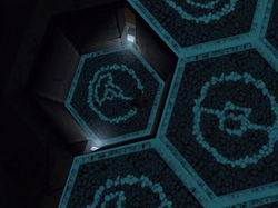 しばらく光をフロアに当ててから部屋を暗くしてみると、青い模様がタイル上に浮かび上がります。ドニシティーのギャラリーには”木のシンボル”と受け取れるステンドグラスパネルがあります。青く浮かび上がったタイルの模様の中の「木のシンボル」を辿っていきます。一番奥のタイルまで辿り着くと、そのタイルがエレベーターとなって下の階へ降りて行きます。