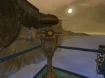 スコープを左右上下に移動させて(左に移動)観察すると、先ほどの海辺の広場にあった小屋のハシゴと石の錘(おもり)が見えます。現時点ではハシゴは通路まで達していないので登る事は出来ません。右に移動するボタンと上下させるボタンの間にはズームスライダーがあるので、それでズームして狙いを定めます。石の錘(おもり)をめがけてシューティングしてみましょう。石が砕けてハシゴが降りてくるのを確認できると思います。