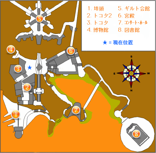 ネクサスから「タコタアレイ」に接続してきました。タコタアレイのネクサススタンドの真上に2個目のマーカーがあります。階段を上がってそのすぐ右横の細い通路を行くとマーカーにたどり着けます。2個目のマーカーの所から階段の所まで戻りそこを左に進むとテントがあります。そのテントがあるところにアエグラのマップがありますので一度「KI」で撮っておきましょう。次に博物館に向かいます。博物館入口の左側に3個目のマーカーがあります。