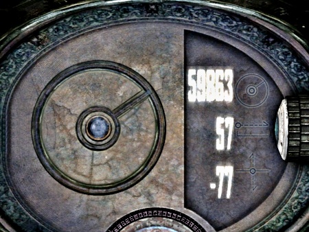 今度は隣の装置(左側奥)の装置をクリックします。こちらの装置は「距離表示」を有効にするための装置です。先程と同様に、左側半分には矢印のシンボル、右側半分には3つの数字が描かれています。すでに「角度表示」は有効になっているので、ドニのそれぞれの場所の「角度」を調べることも可能です。(ベヴィン→60100付近、キレル→60000付近、アエグラ→58000~62000付近)。目的のマーカーはアエグラにあるようです。カディッシュのギャラリーにマーカーがあります。道順はレズィーロ→レルト→カディッシュ・トレサ→ギャラリー→レルト→ネクサス→レズィーロです。