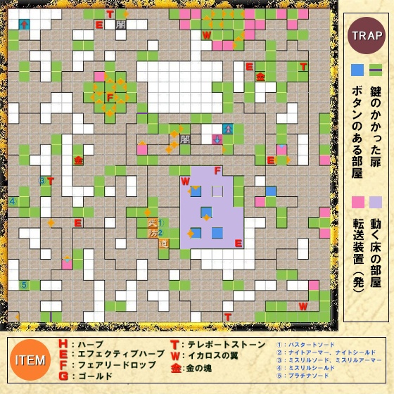 この階では武器・防具系アイテムが入手できる。ただ、、どれもレベルの低い装備なので、ネズミの後に、地上の店で換金してしまおう。