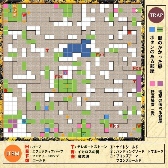 転送装置や鍵のかかった扉などのトラップが非常に多い。ミスが即命取りに繋がる場合もあるので、攻略には細心の注意が必要だ。
