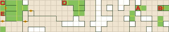 まず、ラフィンを倒した後に転送装置A(地点A)を使うと、地点Bへと跳ばされる。戻る時は地点B→Aというルートになる。 次に、防具屋の後ろにある転送装置C(地点C)からは、地点Dに跳ばされる。その先の部屋で、石板のかけらが2枚手に入るぞ。 ただし、戻る場合は転送装置D(地点D)から地点Eへというルートになるのだ。