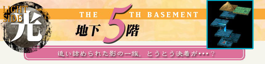物語の舞台は、敵の本拠地である地下城の地下5階。ここには、ポルックスたち光側から見た敵の頂点というだけでなく、今亡き影側の英雄アストラルの父で、影の一族の王でもあるウォトシーカがいるはず。しかし、まず階段のある部屋から一歩出ると、凸凹コンビが闘いを挑んでくる。そして、勝利とともに胸にこみあげる痛みと似た哀しみに、理由もわからず戸惑うポルックス。