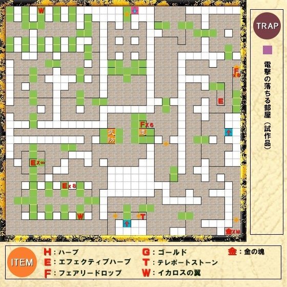 この階のアイテムは、1ヵ所に大量に置いてあることが多い。トラップでは、フロアの東側の雷発生装置がダメージが大なので注意。